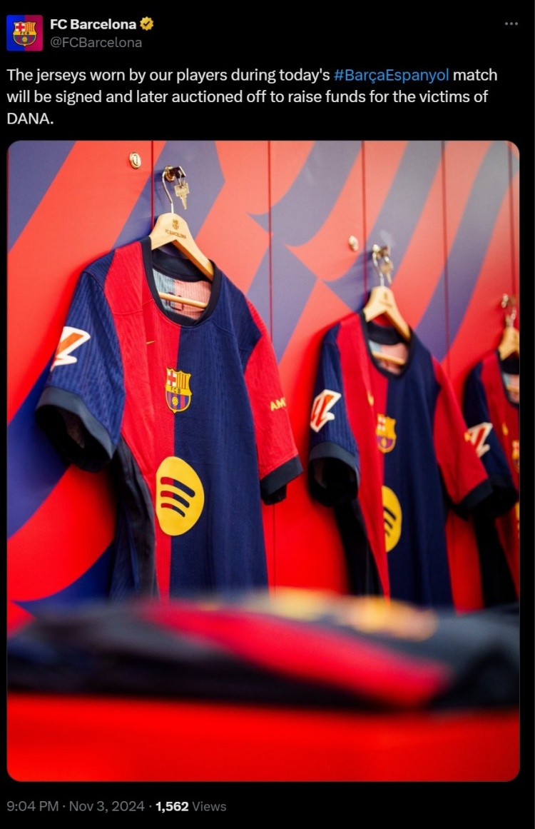 巴萨官方表示,在对阵西班牙人的比赛后,球员们将为自己穿过的球衣签名。这些球衣将被拍卖,从而为风暴“达纳”的受害者筹集资金。