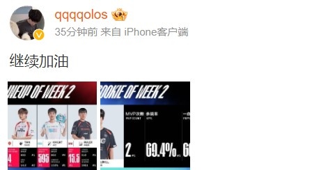 6月17日宣 EDG上单选手Solokill入选LPL夏季赛定组赛第二周最佳阵容,并且拿到上周最佳新秀,Solokill选手微博发文:“继续加油。”