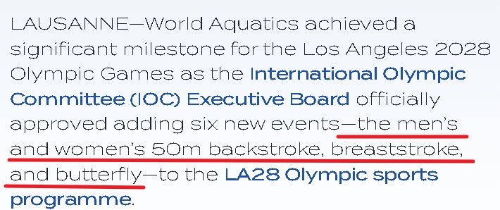 4月10日宣 世界泳联宣布,国际奥委会执委会正式批准男女50米的蛙泳、蝶泳、仰泳共六项成为2028年洛杉矶奥运会项目。