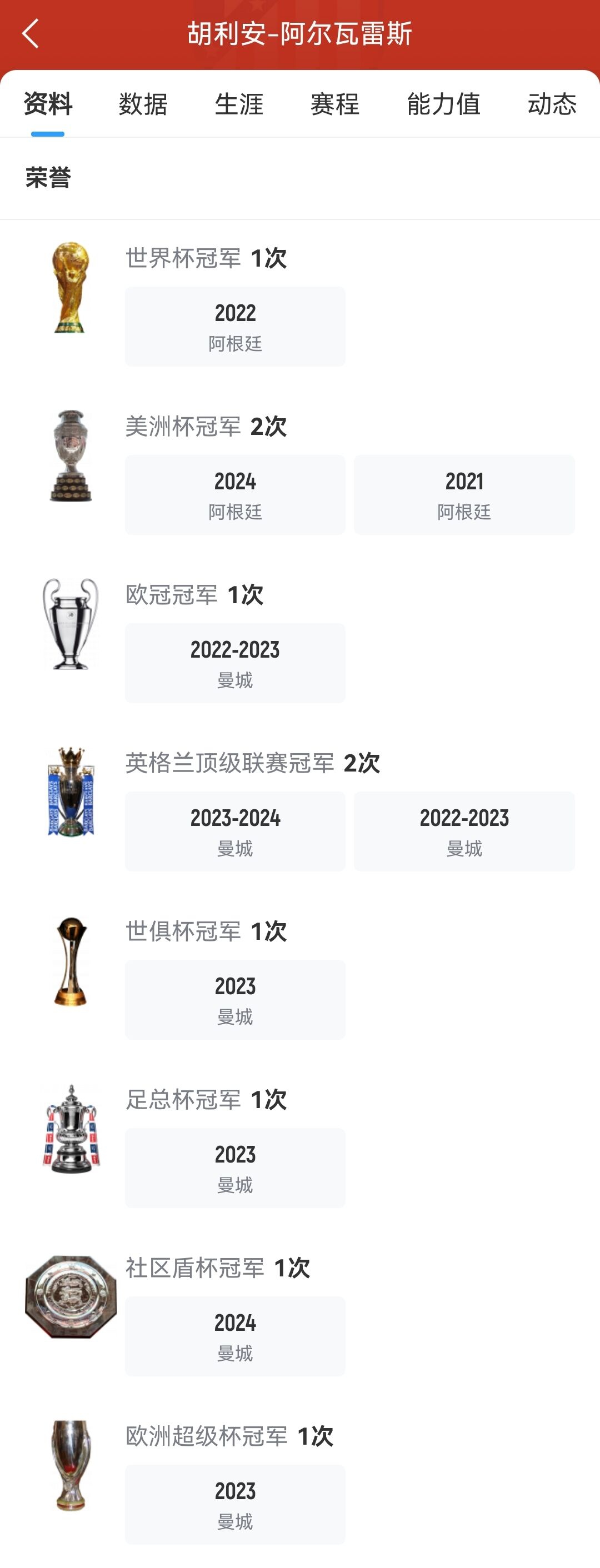 在25岁前,阿尔瓦雷斯就已经包揽世界杯、欧冠、英超、南美解放者杯、世俱杯、足总杯等大大小小超过15个冠军奖杯。