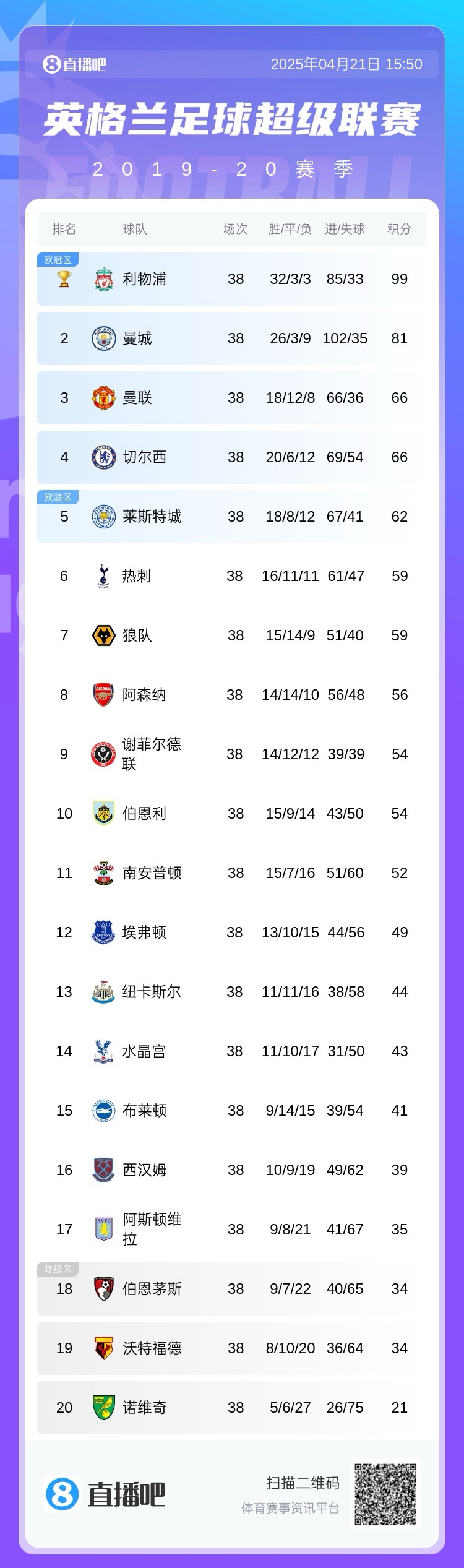 2019/20利物浦:提前7轮夺冠