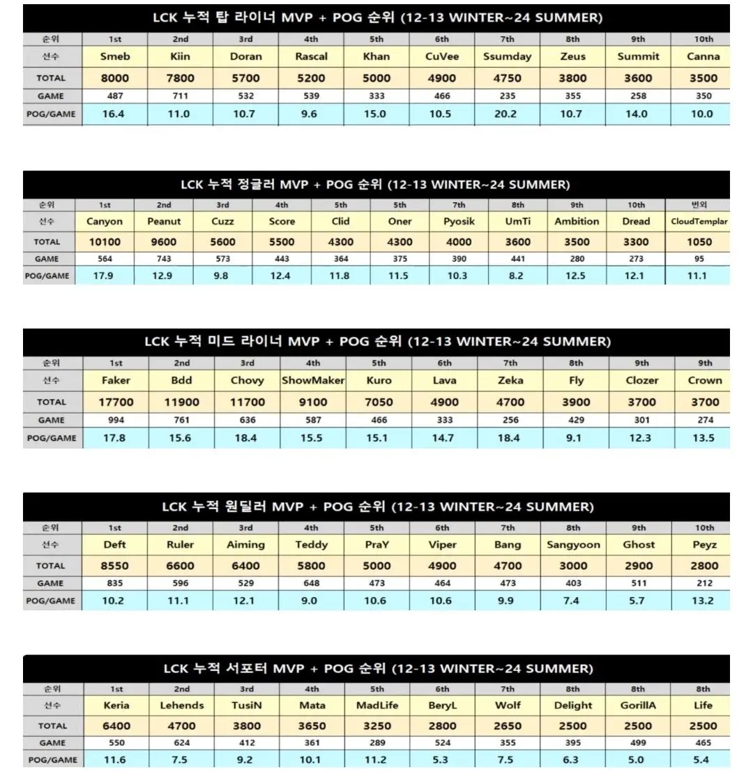 5月2日宣 近日,韩网有网友统计了LCK历史MVP(最有价值选手)和 POG(当场最佳选手)积分数据。