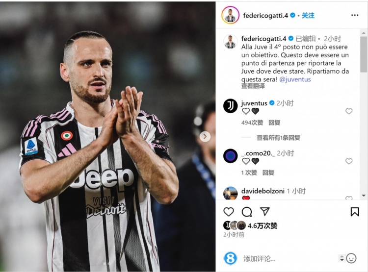 加蒂社媒:第四名不能是尤文的目标,必须成为回到应在位置的起点