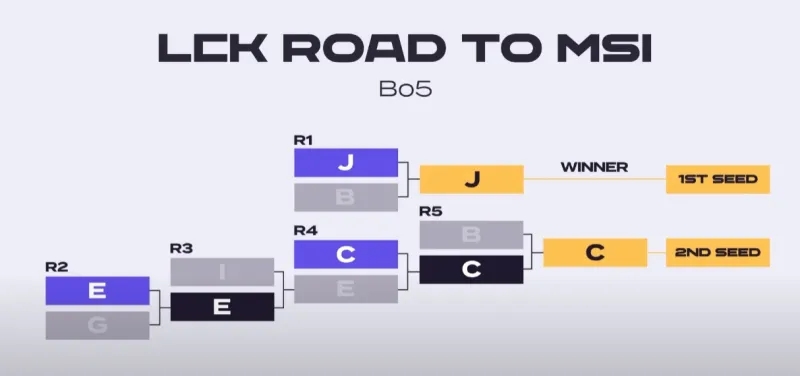 近日有韩国网友发现,LCK的MSI规则介绍图中与LCK资格赛的晋级情况完美符合,可以将介绍图(第一张)中的E代入为KT,J代入为GenG,C代入为T1,与第二张的LCK MSI晋级图对比,两张图的晋级情况犹如巧合。
