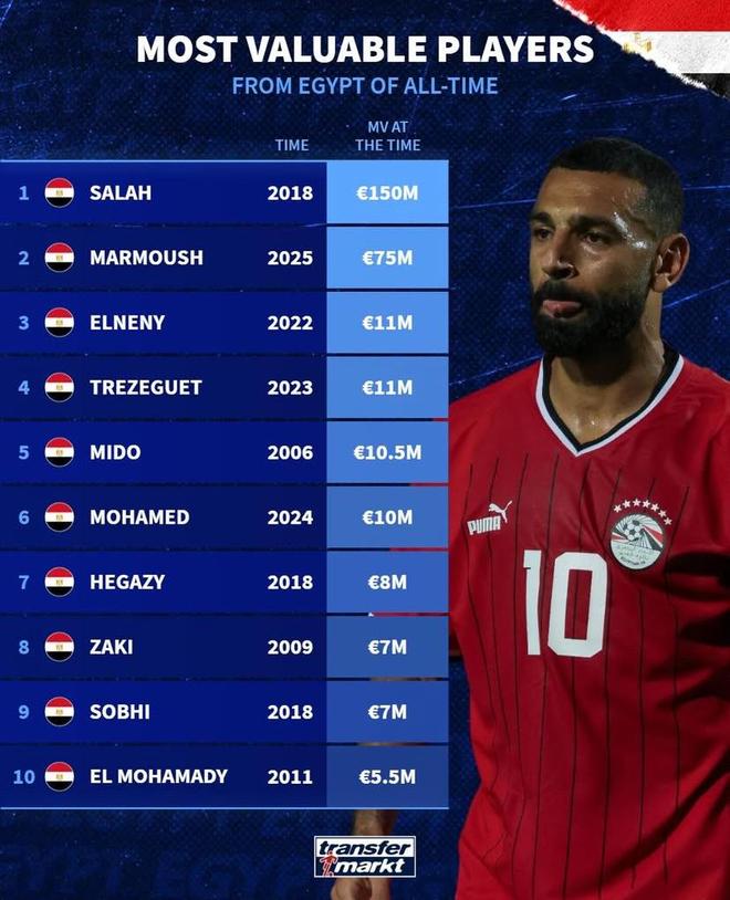 - 英超 | 德转列埃及球员历史身价榜:萨拉赫1.5亿第1,马尔穆什第2