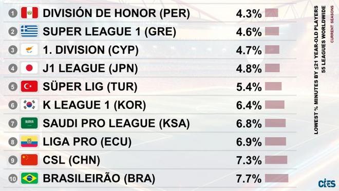 近日,瑞士著名足球权威统计机构CIES(国际体育研究中心)发布了一份针对全球55个顶级联赛的最新统计报告,衡量各国联赛对年轻球员的培养力度,U21球员出场时间占比。这份榜单的排名方式是由低到高,即排位越靠前,代表该联赛的U21球员出场时间占比越少,也意味着这个联赛越不给年轻人机会。榜单数据显示,中超联赛在这份榜单的排名中高居前列,揭示了中国足球在青训转化上的深层危机。