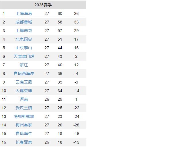 - 中超 | 中超第27轮:海港申花双雄险胜,蓉城重回第2,青岛深陷降级区