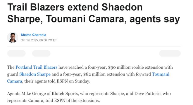 根据ESPN名记Shams报道,开拓者队与谢顿-夏普签下一份四年价值9000万美元的提前续约合同。