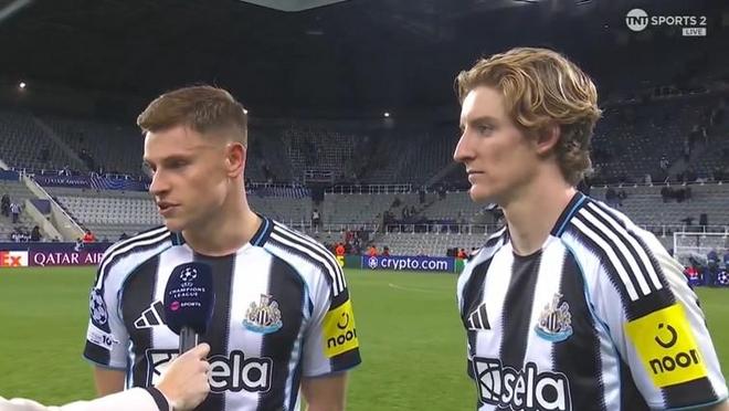 欧冠联赛阶段第3轮一场较量,纽卡斯尔联主场3-0完胜本菲卡。赛后,进球功臣安东尼-戈登和哈维-巴恩斯在场边接受了TNT体育的采访。