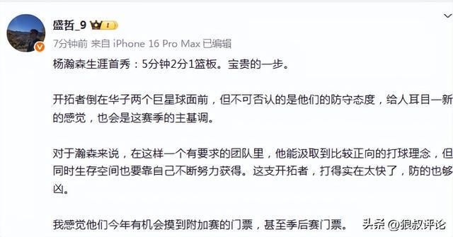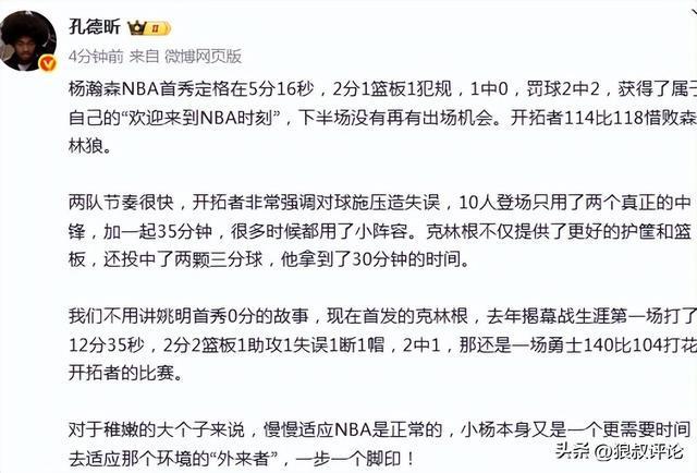 媒体人“孔德昕”发文点评:杨瀚森NBA首秀定格在5分16秒,2分1篮板1犯规,1中0,罚球2中2,获得了属于自己的“欢迎来到NBA时刻”,下半场没有再有出场机会。开拓者114比118惜败森林狼。