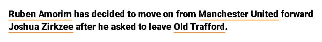 阿莫林最近公开评价齐尔克泽和科比·梅诺时说他需要所有球员,然而私下他已经同意齐尔克泽的转会。据称,阿莫林告诉曼联管理层,可以听取对齐尔克泽的报价,无论是永久转会还是租借转会都有可能。该球员不缺乏买家,留在英超也是一种可能,保级球队西汉姆联有意引进。