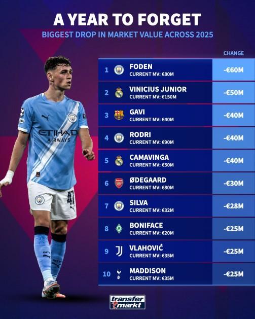25年德转身价跌幅前10:福登跌6000万最高,维尼修斯跌5000万