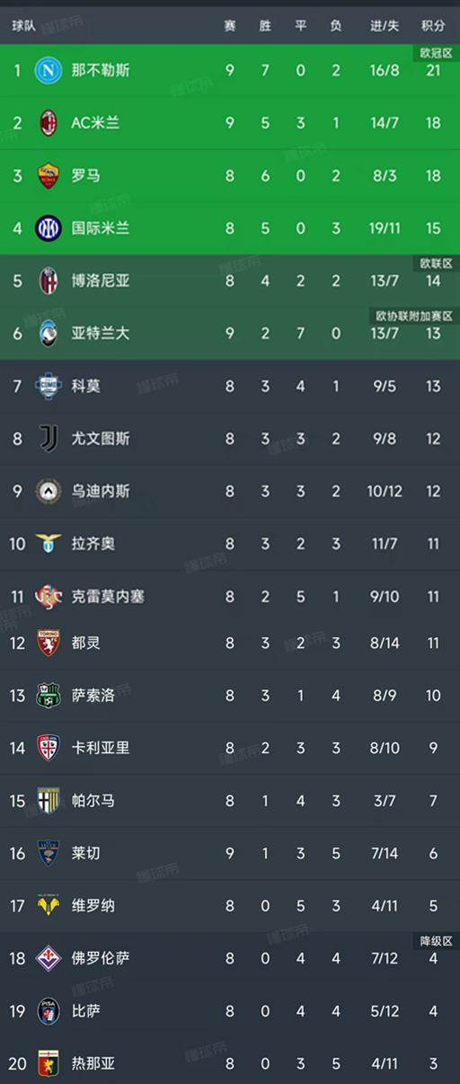 - 意甲 | 意甲第9轮结束了两场比赛,最新积分榜如下!