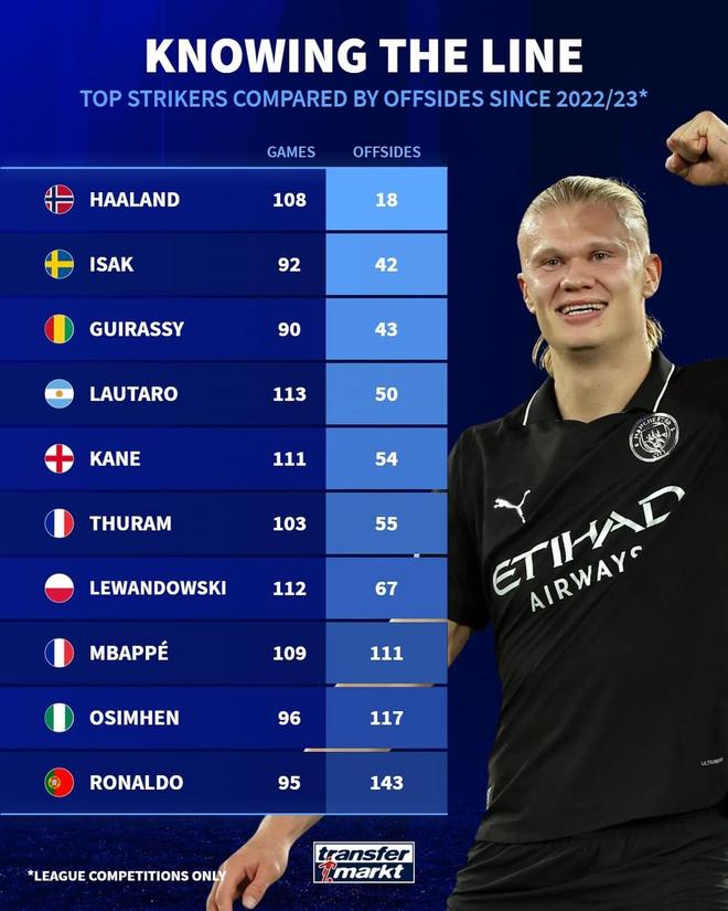 - 英超 | 2223赛季以来顶级前锋越位数:哈兰德仅18次,C罗143次
