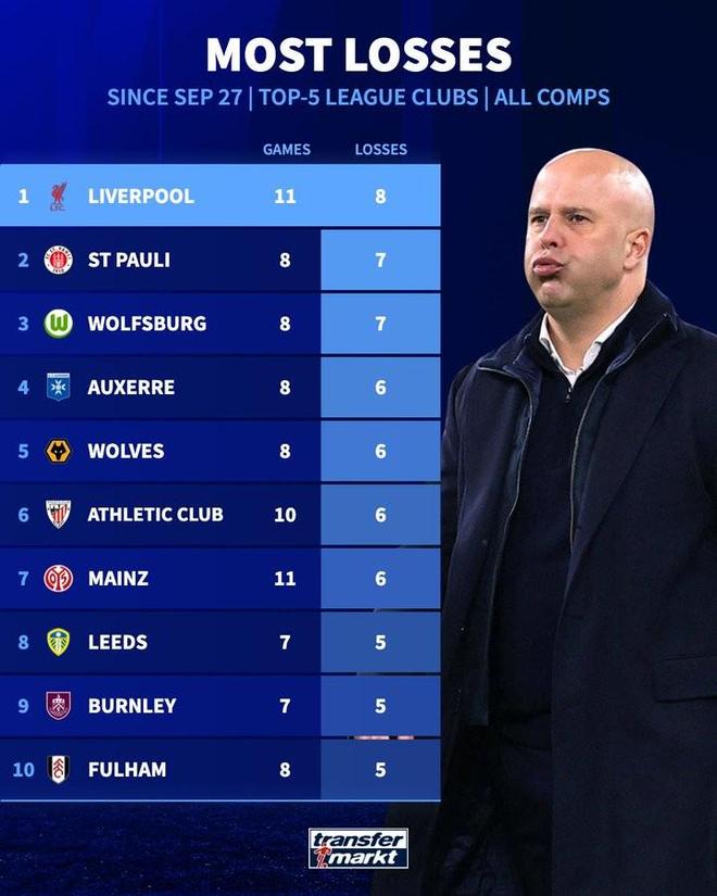 据德转统计,利物浦是自9月底以来五大联赛输球场次最多的球队,他们在11场比赛中输掉8场。