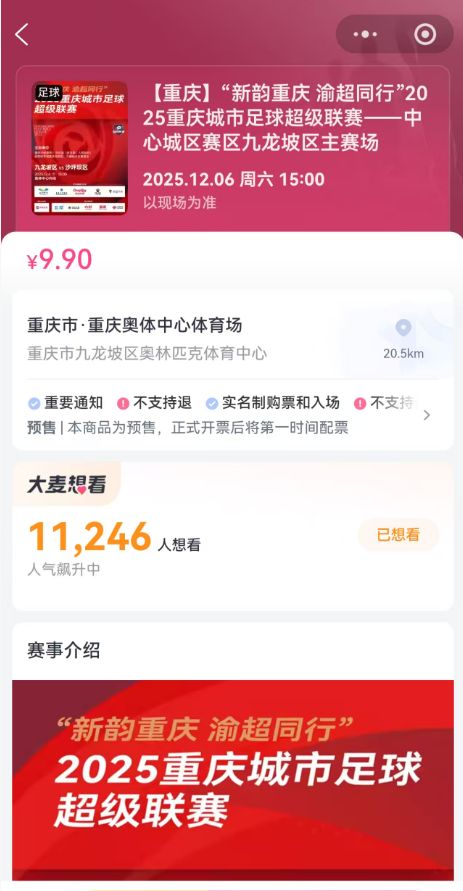 重回奥体看球带热了九龙坡首个主场的球票。“渝超”官网截图