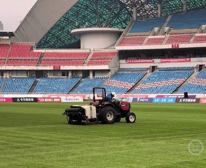 作为曾经举办过中超联赛的球场,重庆奥体中心也对比赛区域进行了恢复和升级。记者在现场看到有工作人员驾驶着割草机,对草坪进行最后的维护,还有工作人员在安装球门后方的球网,对更衣室再次进行清洁,并布置场边的替补席。