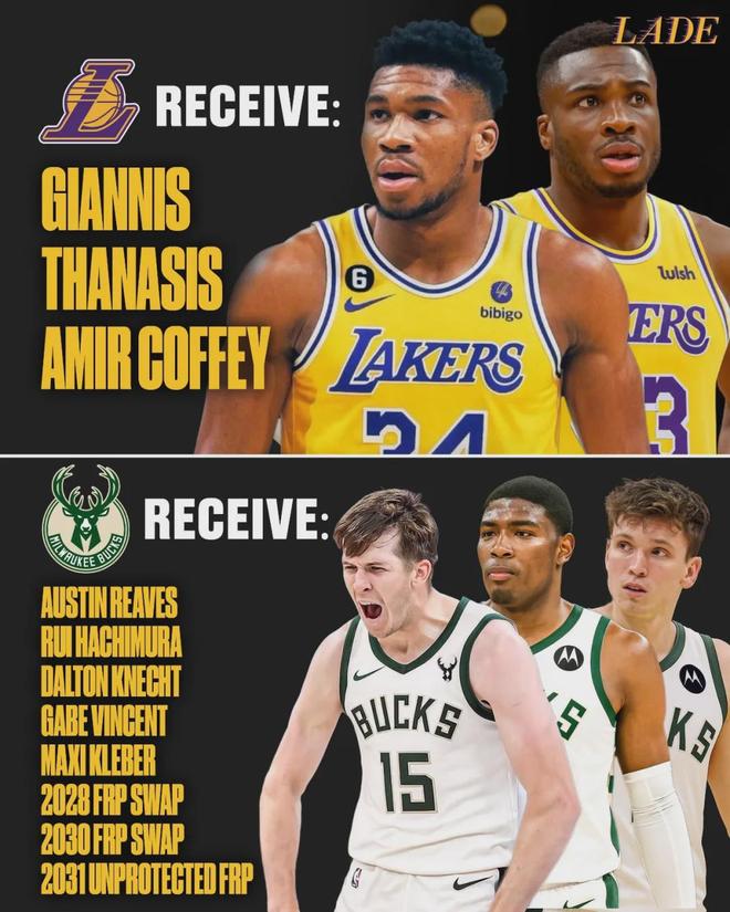 湖人送出里夫斯、八村塁、克内克特、文森特、克莱伯、2个首轮签互换权和1个无保护的首轮签,从雄鹿得到字母哥、字母大哥和科菲。