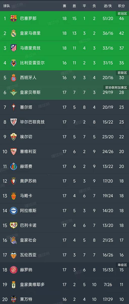 - 西甲 | 西甲第17轮结束了9场比赛,最新积分榜如下!