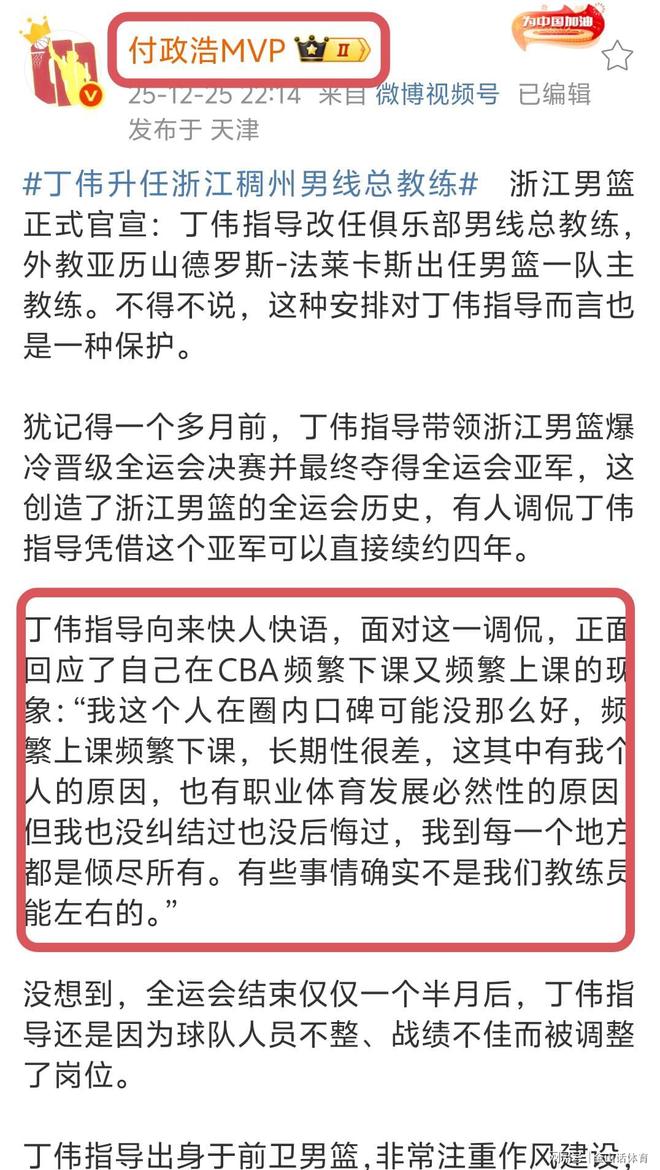 - CBA | 第8次下岗!丁伟回应频繁“下课”原因,付政浩谈丁团长新职务
