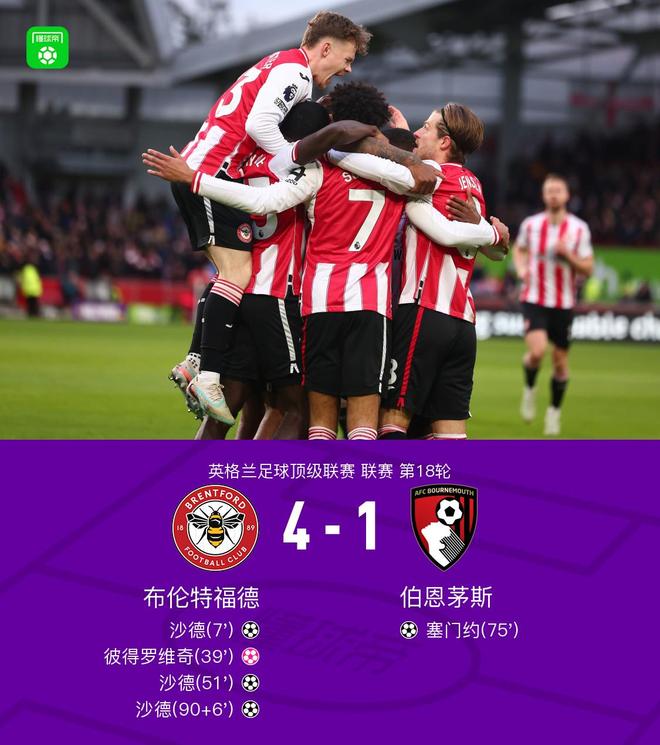 - 英超 | 布伦特福德41伯恩茅斯,沙德戴帽,彼得罗维奇乌龙,塞门约破门