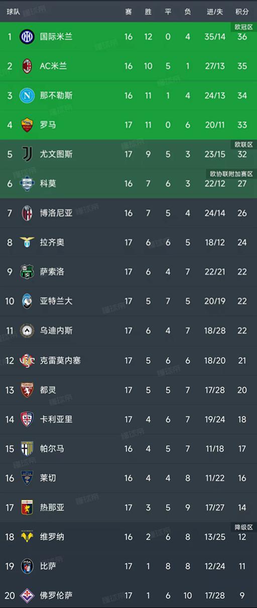 - 意甲 | 意甲第17轮结束了所有比赛,最新积分榜如下!